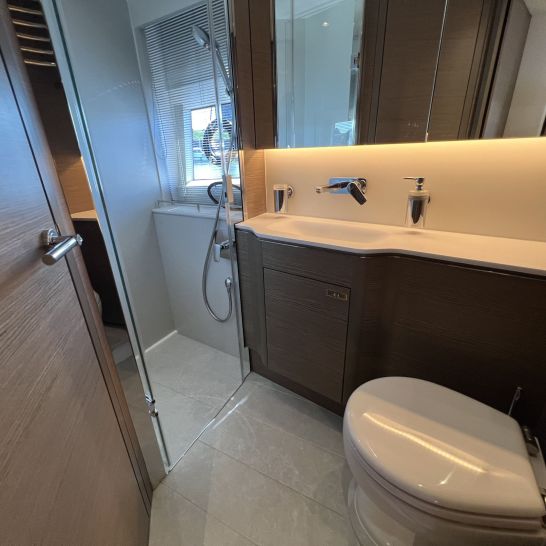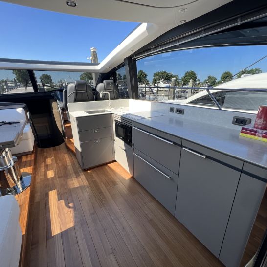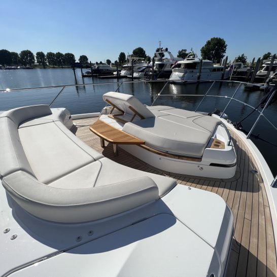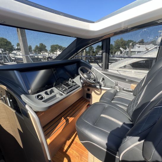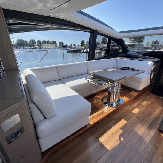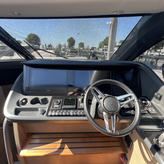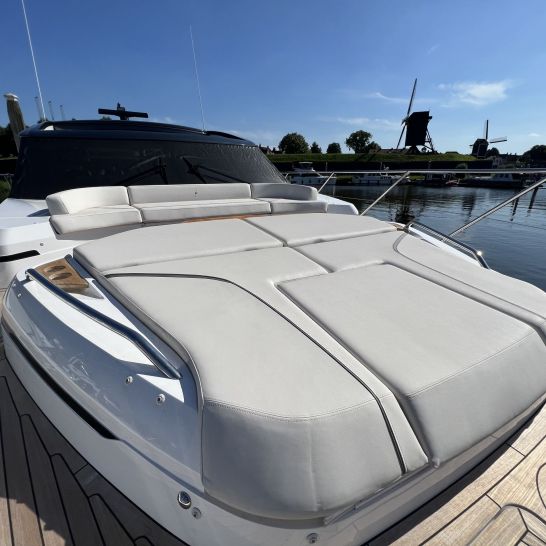 Het dynamische exterieur met panoramische rompramen verbergt een verrassend ruim en licht interieur. Het hydraulische zwemplateau, het doorlopende dek, de naadloze overgang tussen cockpit en salon en het elektrisch te openen zonnedak maken deze V55 perfect voor comfortabel en stijlvol varen.